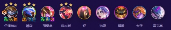 2、5人口慢搜EZ丽桑卓大虫子和挖掘机三星,顺便搜潘森三星,EZ丽桑卓加上一个前排三星之后上人口,8人口搜一张锐雯,最后上9人口凑齐全部羁绊。